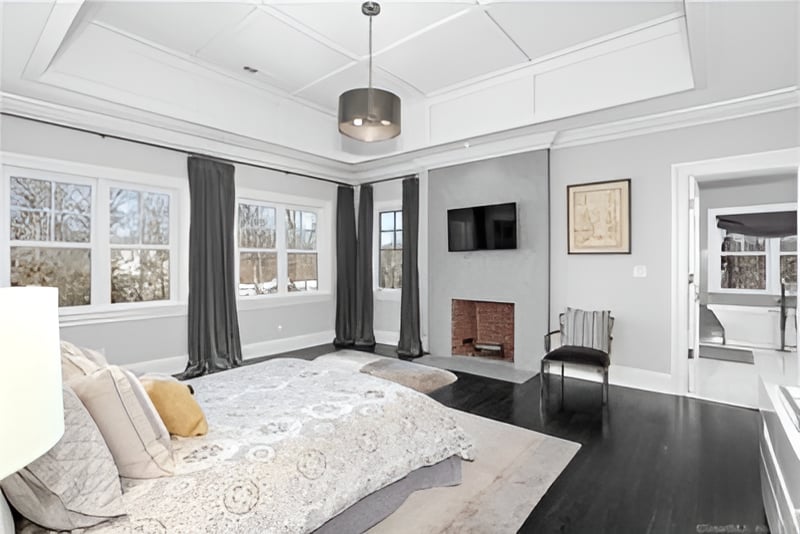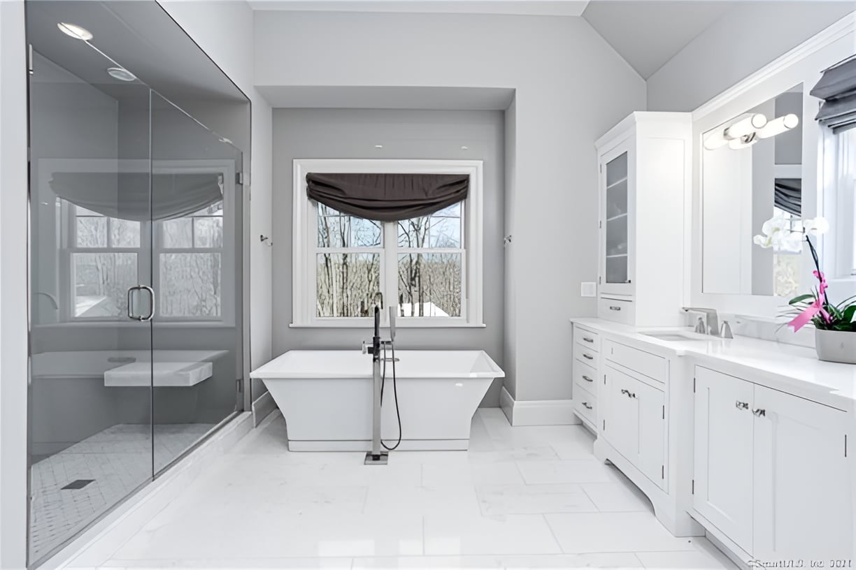 French doors from the family room open onto a bluestone patio, just steps away from the approved pool site, offering privacy and practicality. The Master Suite is your private oasis with vaulted ceilings, spacious custom walk-in closet, fireplace, freestanding soaking tub, and radiant floors. Four more generously-sized bedrooms are on the same level, each with en-suite baths and walk-in closets.