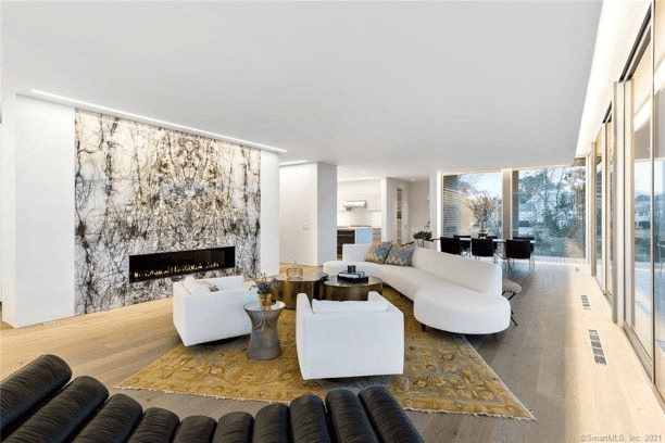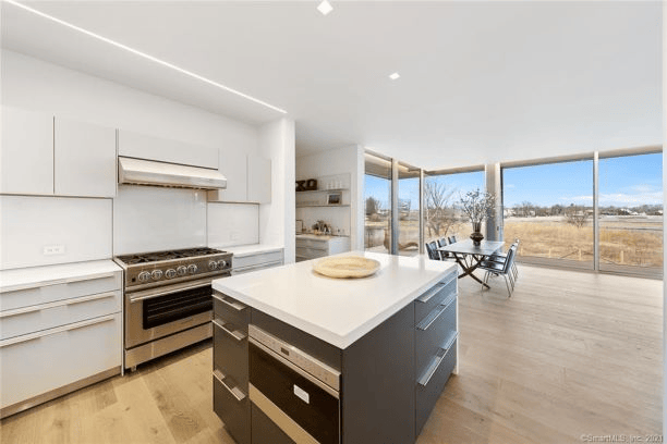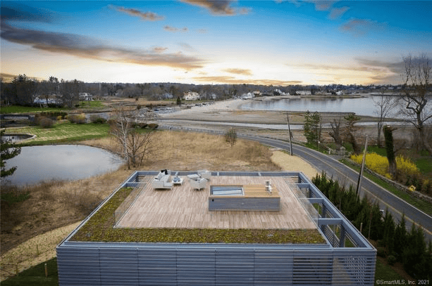 The house boasts 4,250 square feet of interior space plus 3,250 square feet of exterior space with floor to ceiling windows and sliders throughout. The open plan first floor with state of the art Bulthaup kitchen, dining room, living room and office all have water views. Custom mill work throughout, European live sawn oak hardwood floors and a floor to ceiling wall of book marked quartz fireplace are just a few notable features.