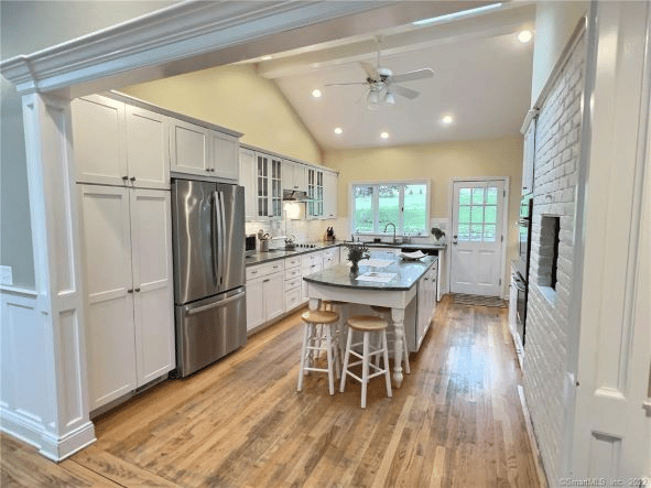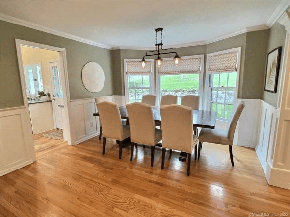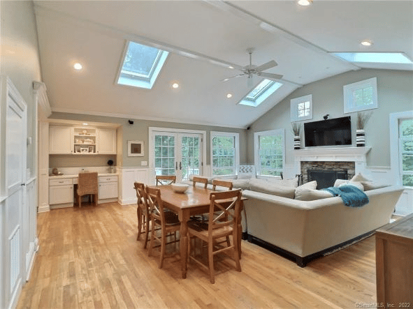 23 Ellery Lane, Westport. Sited on a beautiful acre in the heart of Greens Farms, this picture-perfect Colonial-Split offers space and flexibility for today’s lifestyle. Beautiful formal living and dining rooms, with detailed moldings and bright windows. The spacious kitchen leads to the expanded family room with vaulted ceilings and custom-built-ins.