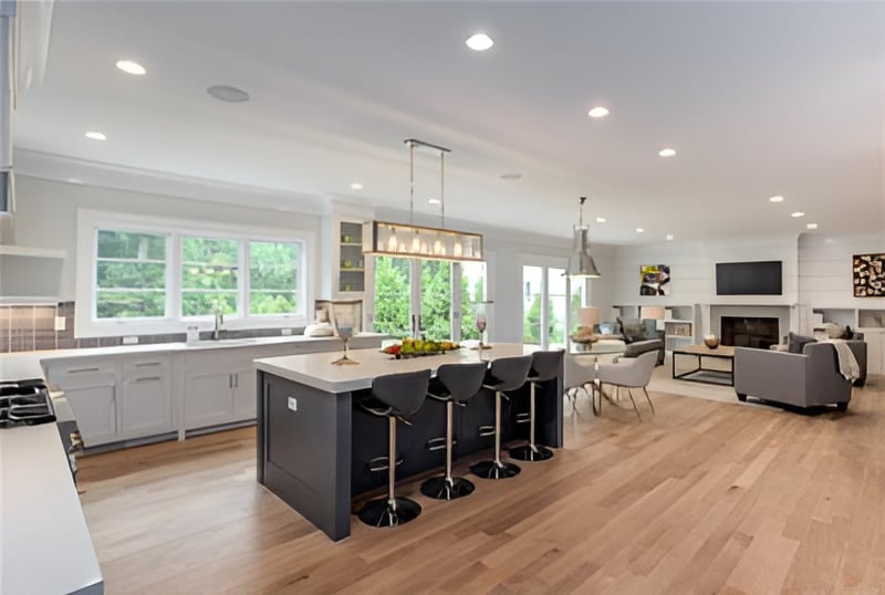 3 Eno Lane’s eat-in kitchen is located adjacent to the living room and boasts high-end appliances. Including white Caesar Stone counters, 8 burner gas cook-top, Thermador stainless steel appliances, a wine-fridge and wet-bar.