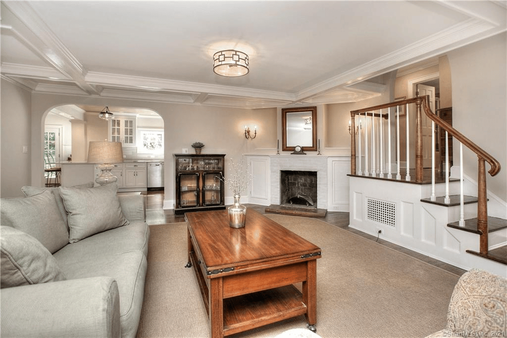 It sits on a picturesque, nearly 2-acre lot with ample level lawn for you to call home! Entering the home, you will be impressed with the country marble flooring in the foyer, which leads to the library/office with custom built/in bookcases and paneling. Heading up the staircase, there is a formal living room with an open layout, a coffered ceiling, and a fireplace.