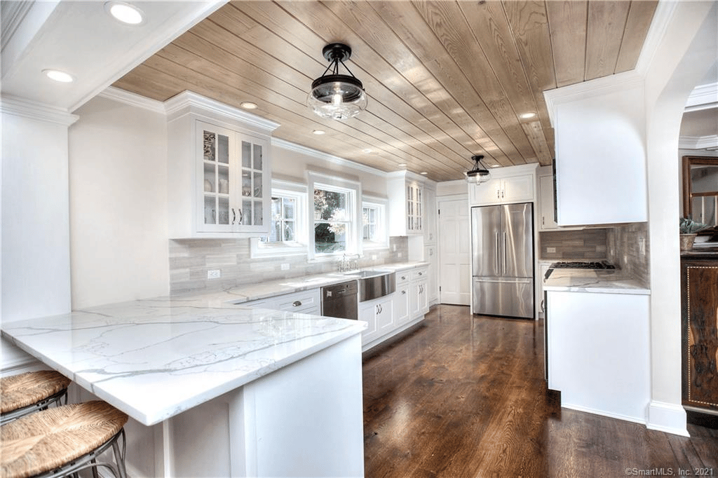 From there, you can access the recently updated kitchen and the oversized breakfast room with additional seating at the kitchen peninsula. The kitchen has quartz countertops/ white custom cabinets, and a farmhouse sink. The spacious dining room area has a butler’s pantry, including a wine cooler, dishwasher, large sink, and white oak custom cabinets. Don’t miss the airy family room, which includes a magnificent stone fireplace, fixed French door panels and two large French doors.