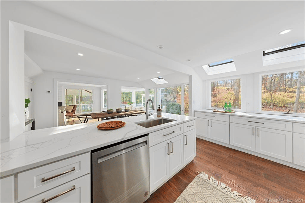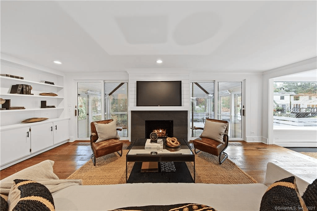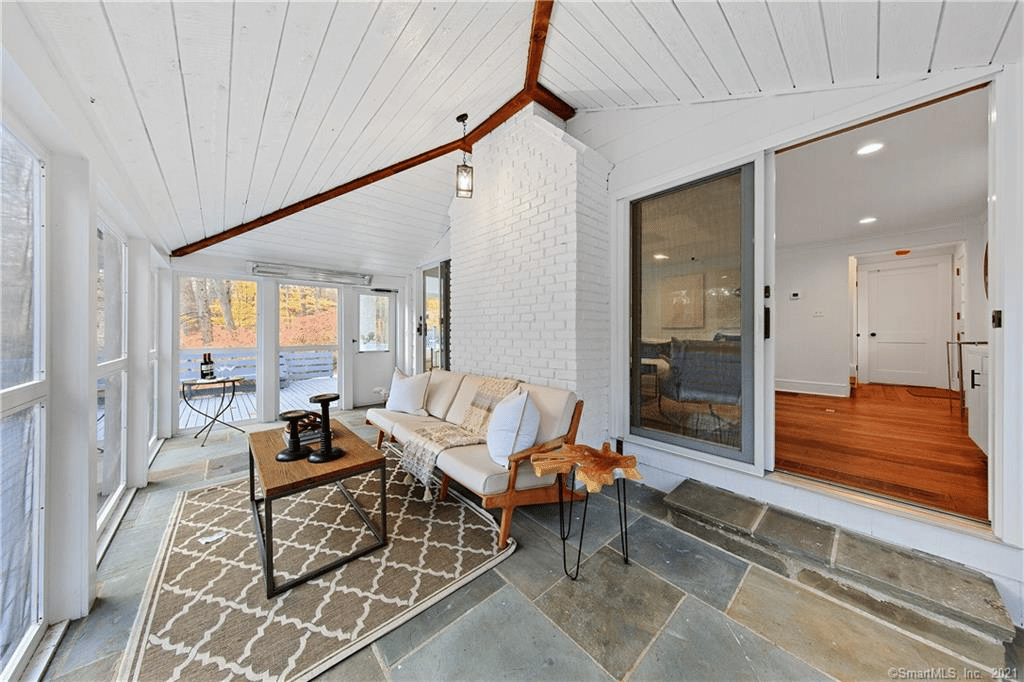 The open floor plan boasts a new kitchen with quartz counters, new stainless appliances, and loads of storage. The newly designed fireplace offers a cozy focal point to the flexible living spaces, and sliders lead to a newly enclosed all-season screened-in porch with heat.