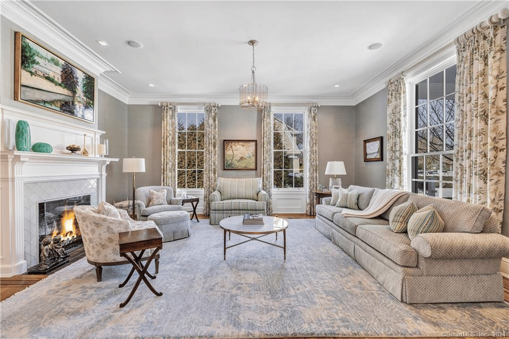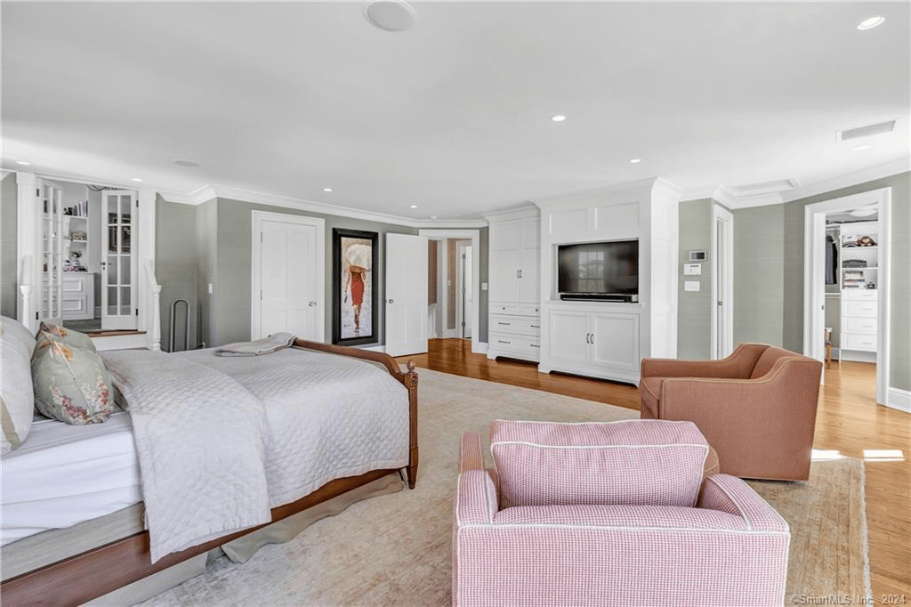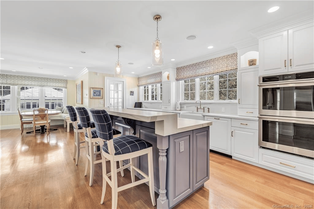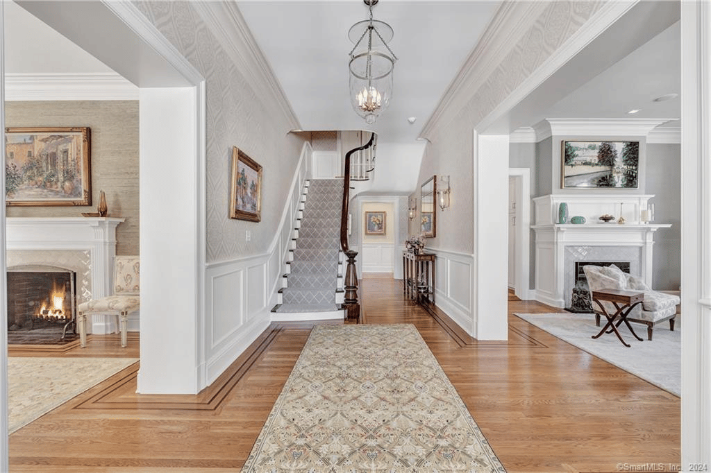 From the moment you enter, you will be captivated by the exquisite symmetry & spectacular design of this historic home. The property features 10′ ceilings, deep crown moldings, double front doors with beveled glass & an elegant main staircase. Formerly the home of celebrated artist Robert Vickery, this property holds a special place in Fairfield’s history. The main floor consists of a Living Room, Dining Room, and Family Room – each adorned with a fireplace, adding warmth and charm to the living spaces; a cherry-paneled Library provides a serene and sophisticated retreat for working or a quiet place to read. The stunning Kitchen is a true masterpiece, complete with porcelain countertops, center island, hardwood floors, double wall ovens, radiant floor heat, double dishwashers, extra fridge drawers, Viking 6 burner stove, butler’s pantry & a walk-in pantry. The Breakfast Nook offers a delightful space to start your day, bathed in natural light.